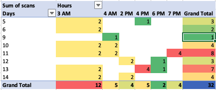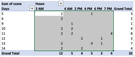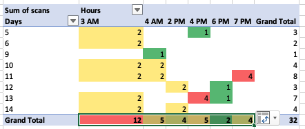 Select all the cells that fall within the range between the first to last Hours column (do not include filter top row, ‘Grand Total’ bottom row or last column (Grand Total)