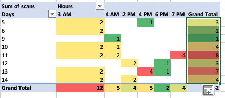 Select the cells in bottom Grand Total row and apply the same color scale (excluding first and last column. Only Hours data cells).