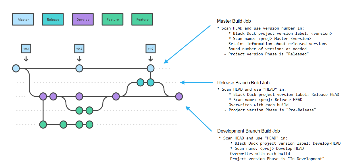 This diagram depicts configuring three types of build/scan jobs that occur whenever a commit happens on their respective branches. The next sections provide details on how to configure scans for each branch.