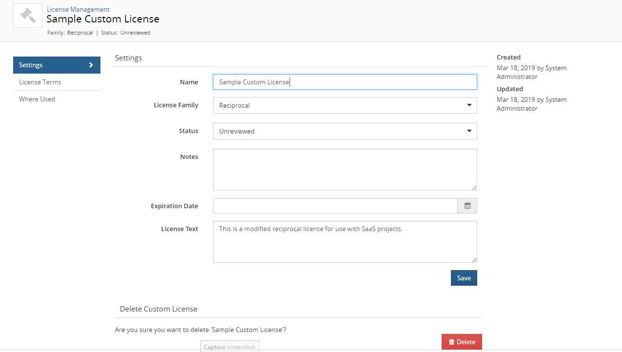 License Managers can make global edits to custom licenses. The License Manager can edit any of the custom license settings.